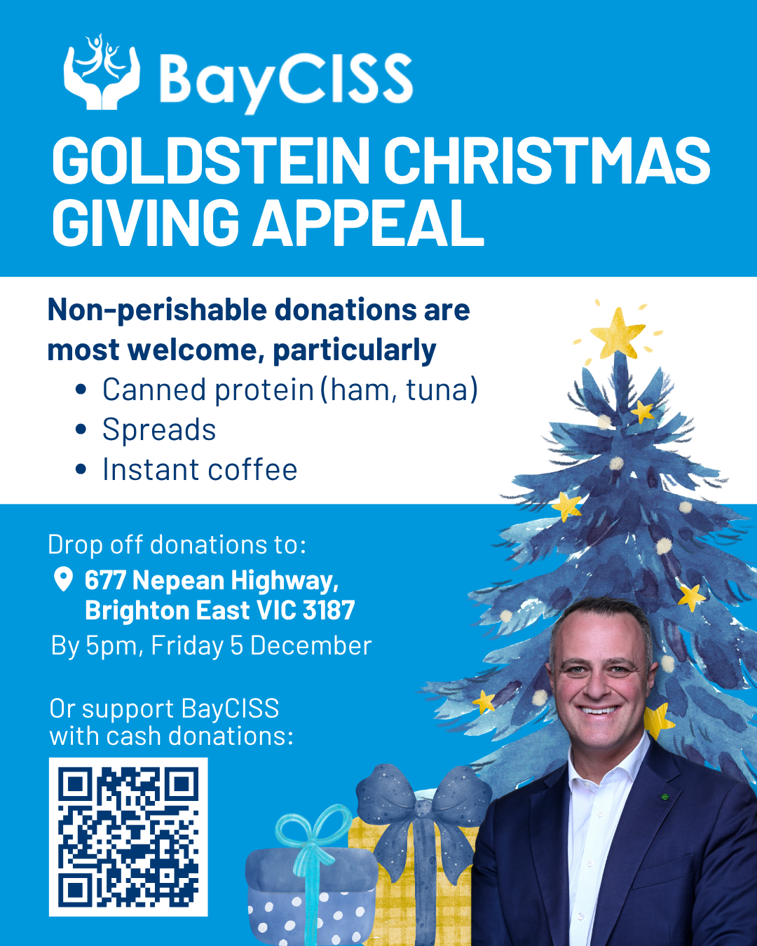 Donations of non-perishable food or other gifts can be brought to the Goldstein electorate office, located at: 677 Nepean Highway, (corner of Centre Rd) Brighton East until 5pm on Friday 5 December 2025 so they can be presented to BayCISS for distribution before Christmas Day.